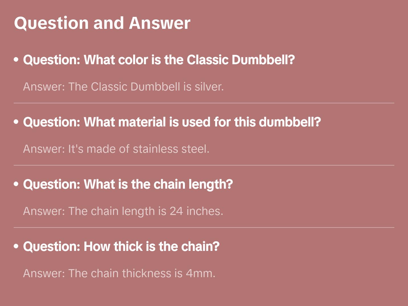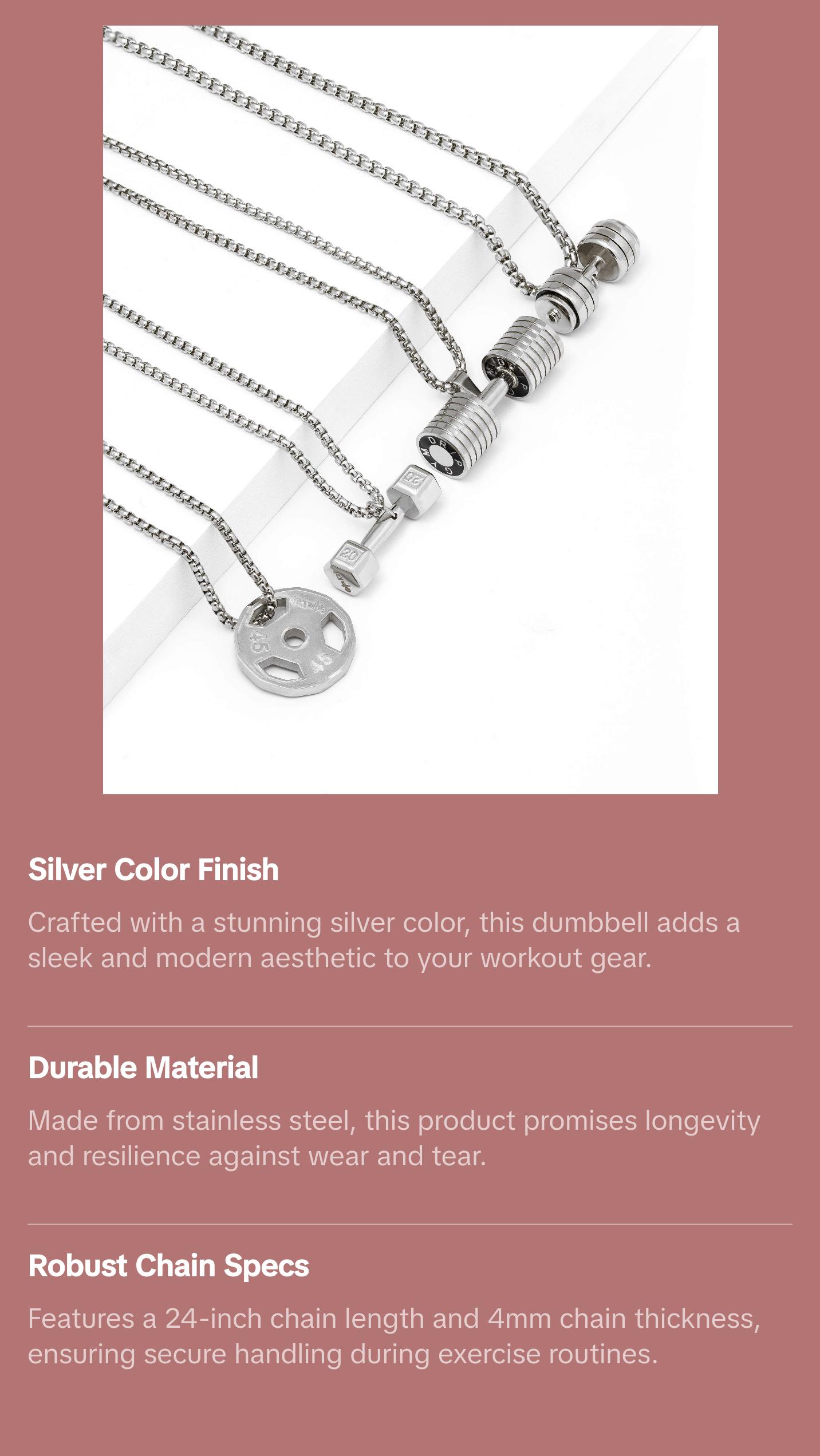 SilverStainless Steel24 inch chain length4mm chain thicknessClassic DumbbellSKU: 44eda7fc-7038-436f-9ca8-4e4263e730e4$40.20PriceSpecification*DefaultQuantity*Add to CartBuy Now
